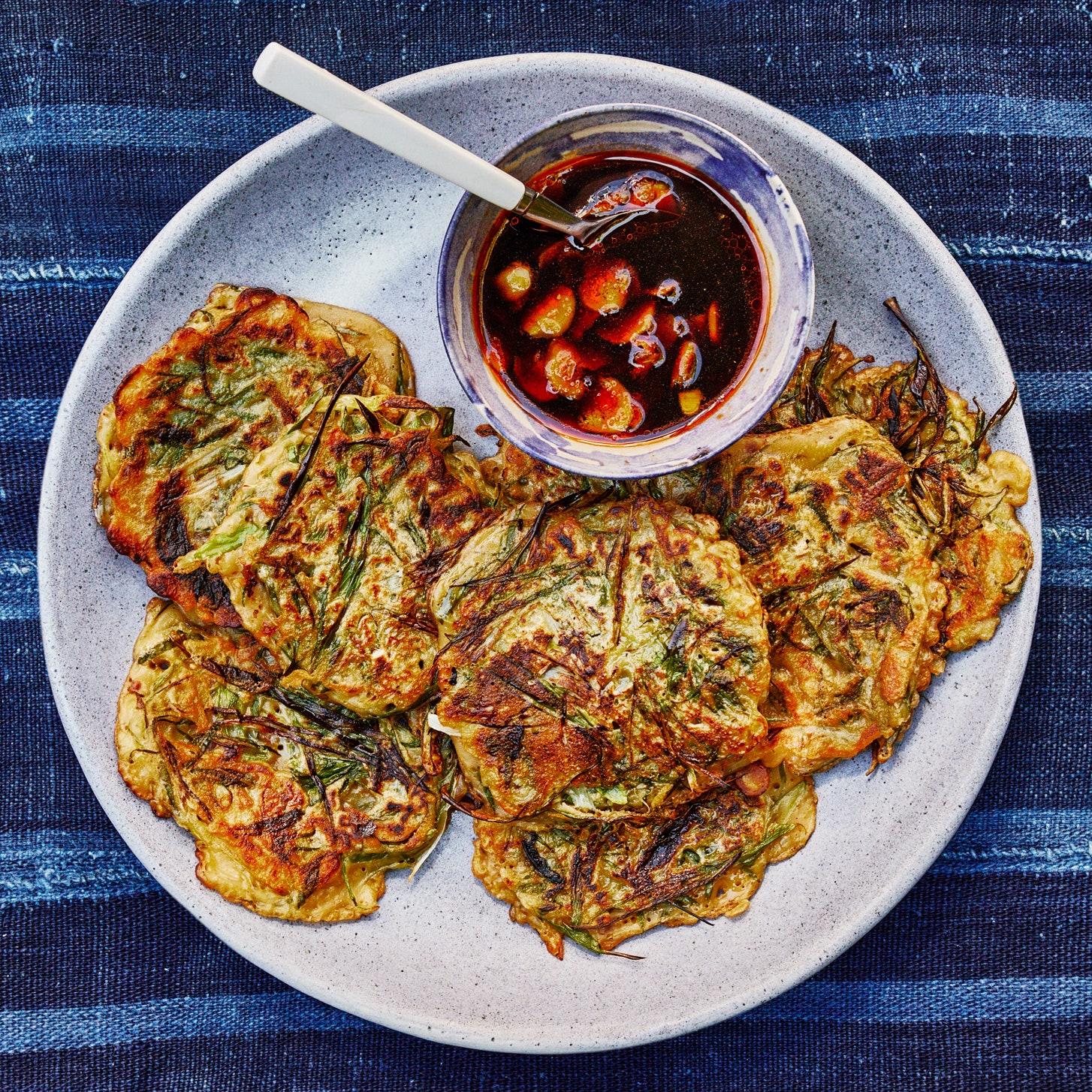 These pancakes, which take inspiration from Korean pajeon, get their light texture from a batter made with club soda, similar to tempura batter. Pressing hard on them when frying makes them crisp, as does the inclusion of cornstarch. The scallions are left in big pieces so they get charred on the edges of the pancake while remaining soft and tender inside.