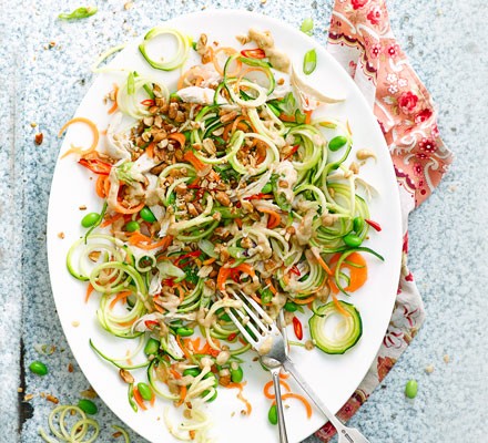 Using a spiralizer fitted with the thicker noodle setting (or a julienne peeler), turn the courgettes and carrots into curly noodles. Tip them into a bowl with the spring onions, beansprouts and soya beans.