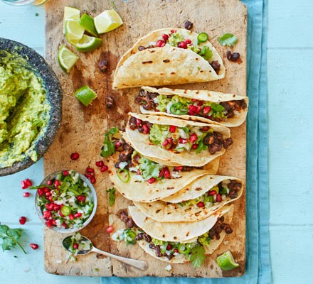 These vegetarian bean tacos, lightly spiced with cumin and smoked paprika, are topped with fresh guacamole and a pomegranate salsa. Method STEP 1 In a large frying pan, heat the…