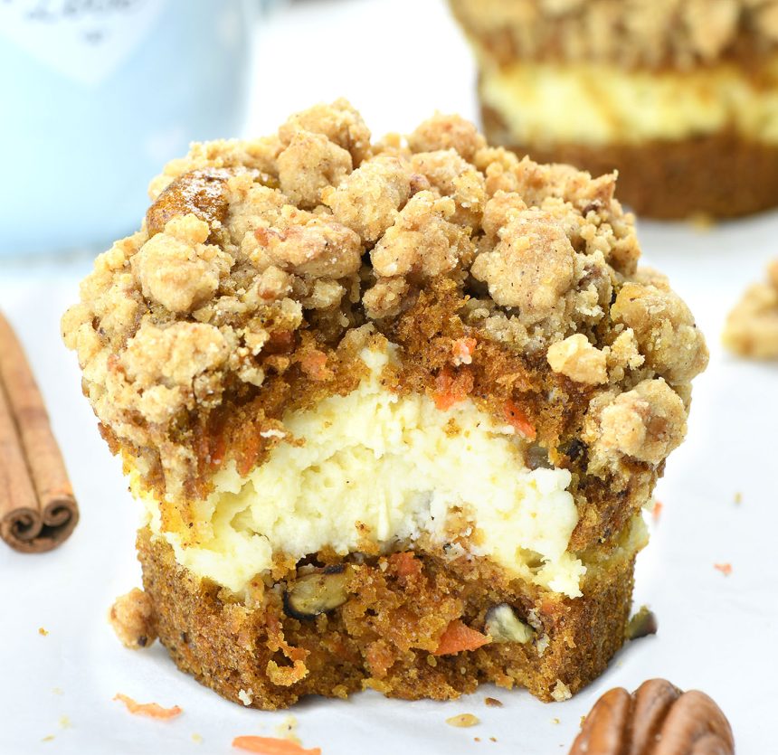 Cheesecake filling takes these mini carrot cakes to another level. Adding cream cheese frosting on top, would make them cupcakes. But a cream cheese center adds the same flavor, plus less sugar, and less fuss.