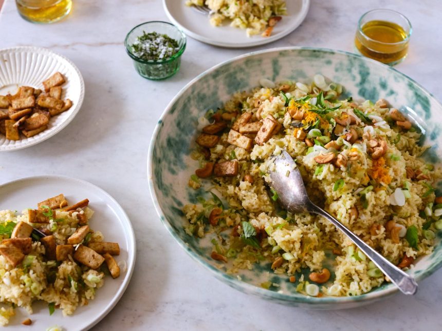 You can easily add another hearty element to this rice and make a one bowl meal. You see the citrus rice pictured here topped with a bit of simply marinated, baked tofu. It’s just slabs of thinly sliced extra-firm tofu tossed in 1 tablespoon olive oil, 1 tablespoon wasabi paste, and 2 teaspoons soy sauce and baked until golden in a 375F oven. Wasabi paste can be tricky to come by, and when I’m out of it I’ll substitute a favorite curry paste or tobanjan paste. Throw some broccoli or cauliflower florets into the oven with the tofu for some added veg. And, you should absolutely use leftovers in this Herbed Rice Salad with Peanuts!