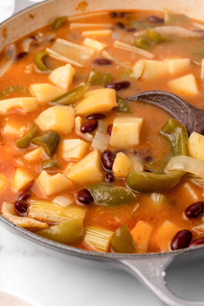 - Stir to combine and then slowly add in the vegetable broth and potatoes and kidney beans and bay leaf.